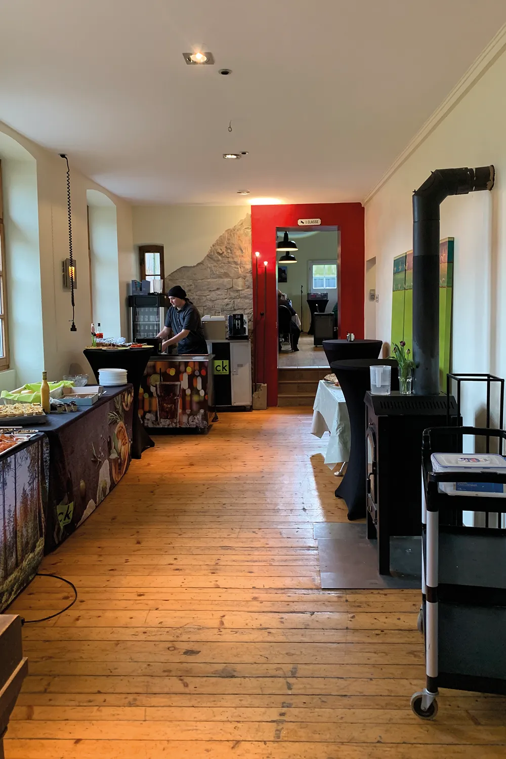 Der Verbindungsraum zur Güterhalle bietet Platz für Buffet, Getränke-, Cocktail- und Kaffeestation und den Plausch am Stehtisch neben dem Kaminofen.